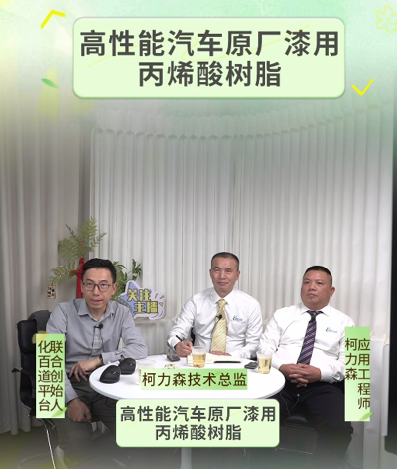 近年来,随着汽车产业的快速发展,汽车行业对原厂漆在外观、环保与耐候方面,有了更高的性能要求。柯力森大力研发汽车原厂漆用树脂,不断取得行业新突破。10月30日晚8点,柯力森树脂携手化百道开展【高性能汽车原厂漆用丙烯酸树脂】专题直播,柯力森技术总监谭征兵、工程师刘怡志坐镇直播间,深度解析行业难点,提供个性化解决方案,直播收到广大业内同仁热捧!